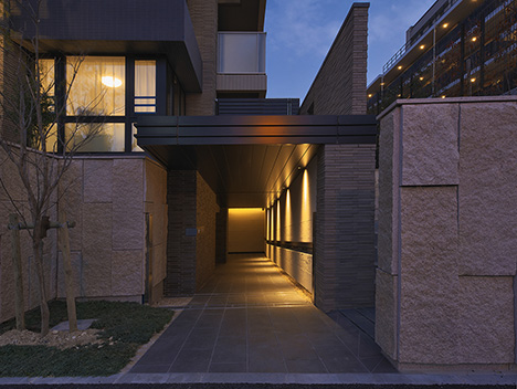 高さ2mの擁壁がパブリックゾーンとプライベートゾーンを切り離しており、幹線道路沿いに建つメリットを享受しながら、プライバシー性を確保している。このサビ石の大判割肌の擁壁と、光の柱が並ぶアプローチが、成熟した住宅街のなかでも特別な邸宅を感じさせる。外観は街並みにあわせ、深みのあるアースカラーを基調とし、コーナーには大きな開口部と墨色のタイルを配しアクセントをつくっている。マンションが立ち並ぶ通りの中で、街に調和しつつ静かに存在感を示している。